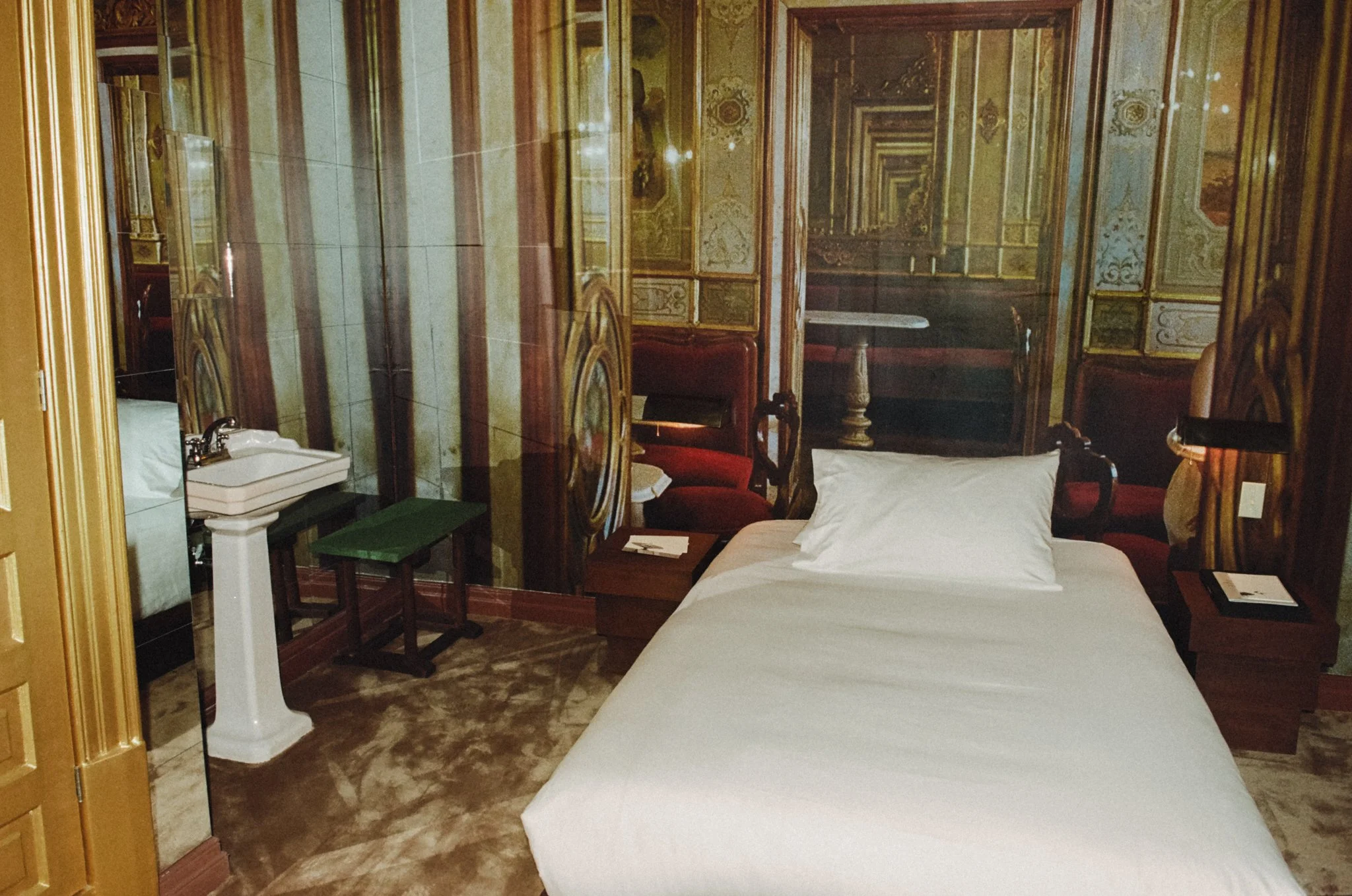 Venetian in spirit, the room feels intimate and cocooned, wrapped in mirrors and warm reflections. A patio-facing balcony draws in soft light, while a full bed and an exposed sink lend the space a quietly theatrical edge.